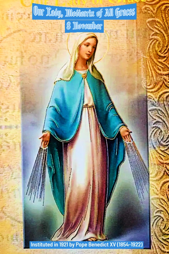 In 1921 Pope Benedict XV instituted 8 November as the Feast Day of Our Lady Mediatrix of All Graces.