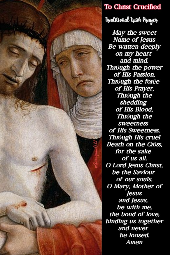 PRAYER – O God, in Whose Passion the sword, according to the prophecy of blessed Simeon, pierced through the soul of Mary, the glorious Virgin and Mother, mercifully grant that we, who reverently commemorate her piercing through and her suffering, may, by the interceding glorious merits of all the Saints faithfully standing by the Cross, obtain the abundant fruit of Thine Passion. Who lives and reigns with God the Father, in the unity of the Holy Ghost, God, world without end. Amen (Collect).