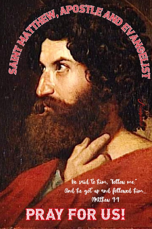 PRAYER – Grant, we beseech Thee, Almighty God that the worshipful Feast of Thy blessed Apostle and Evangelist, St Matthew, on the eve whereof we now stand, may avail us, to the increase, both of godliness toward Thee and of health to our own souls. Through Jesus Christ, Thy Son our Lord, Who lives and reigns with Thee, in the unity of the Holy Ghost, God, world without end. Amen (Collect).