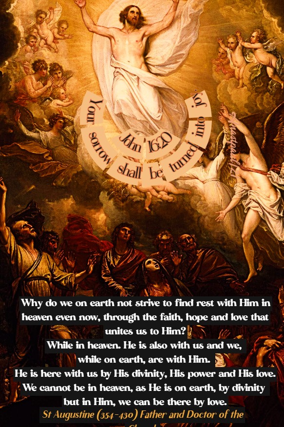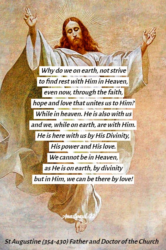 He did not leave heaven when He came down to us, nor did He withdraw from us when He went up again into heaven. The fact that He was in heaven even while He was on earth, is borne out by His own statement – No-one has ever ascended into heaven except the one who descended from heaven, the Son of Man, who is in heaven. … Thus, no-one but Christ descended and no one but Christ ascended; not because there is no distinction between the head and the body but because the body, as a unity cannot be separated from the head” – St Augustine (354-430) Bishop and Great Western Father and Doctor of the Church – An excerpt from his Sermon on the Lord’s Ascension