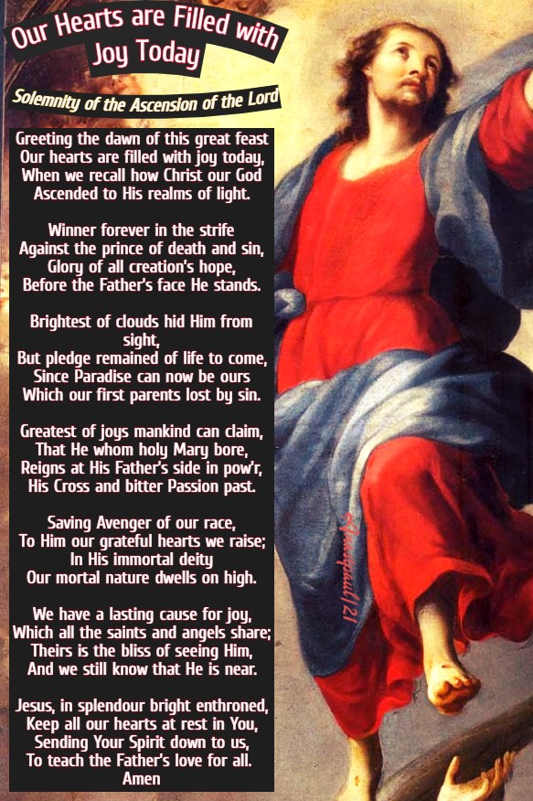PRAYER – Grant, we beseech Thee, Almighty God, that as we do believe Thine Only-Begotten Son, our Saviour, to have this day, ascended into the Heavens, so we may also, in heart and mind, thither ascend and with Him continually dwell.Through the same Jesus Christ, Thy Son our Lord, Who lives and reigns with Thee, in the unity of the Holy Ghost, God, world without end. Amen (Collect).