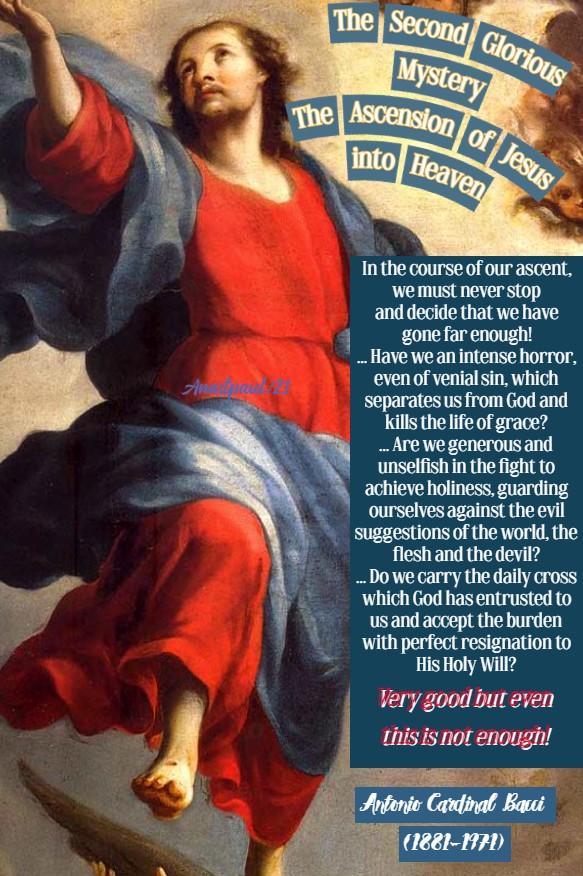 “Forty days after His glorious resurrection, Jesus came, with all His friends, among them His Mother, to the Mount of Olives. This area had already witnessed the opening phase of His passion, which was all the more poignant, perhaps because in Gethsemane, it was not only His body which was lacerated by scourges and nails but, His soul, which experienced the agonising vision of the sins and ingratitude of the human race. Now, however, He is here with a glorified body as the Conqueror of sin and of death. He looks for the last time on His small band of followers, to whom He has entrusted His mission of transforming the entire universe by preaching and putting into practice, the Gospel message, throughout the world. Now, He promises them the Holy Spirit, Who will give them the power to overcome evil. Then He is lifted up toward Heaven, until a bright cloud hides Him from their sight.