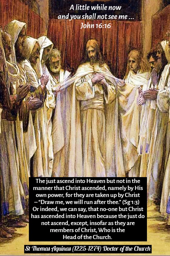 “… The just ascend into Heaven but not in the manner that Christ ascended, namely by His own power, for they are taken up by Christ – “Draw me, we will run after thee.” (Sg 1:3) Or indeed, we can say, that no-one but Christ has ascended into Heaven because the just do not ascend, except, insofar as they are members of Christ, Who is the Head of the Church. … ”