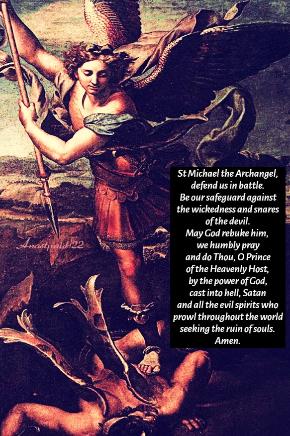 St Michael the Archangel, defend us in battle. Be our safeguard against the wickedness and snares of the devil. May God rebuke him, we humbly pray and do Thou, O Prince of the Heavenly Host, by the power of God, cast into hell, Satan and all the evil spirits who prowl throughout the world seeking the ruin of souls. Amen.