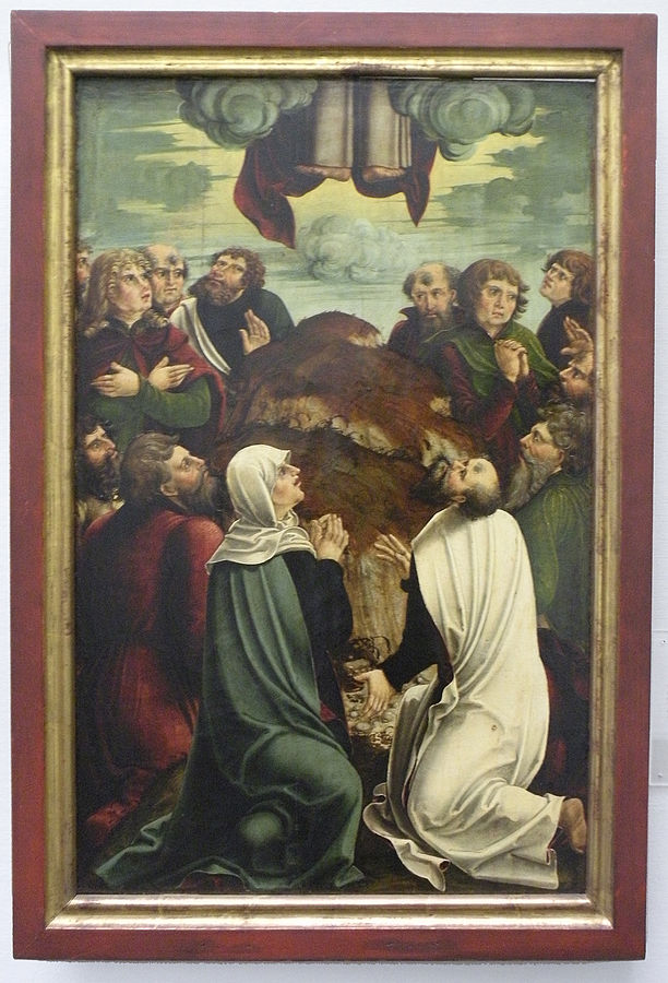 According to a tradition, which has been handed down from the earliest ages of Christianity (Constit. Apost., lib. v. cap. xix), it is mid-day, the same hour that He had been raised up, when nailed to His Cross. Giving His Blessed Mother a look of filial affection and another of fond farewell to the rest of the group, who stand around Him, Jesus raises up His Hands and blesses them all. Whilst thus blessing them, He is raised up from the ground whereon He stands and ascends into Heaven (St. Luke, xxiv. 51). Their eyes follow Him, until a cloud comes and receives Him out of their sight (Acts, i. 9).