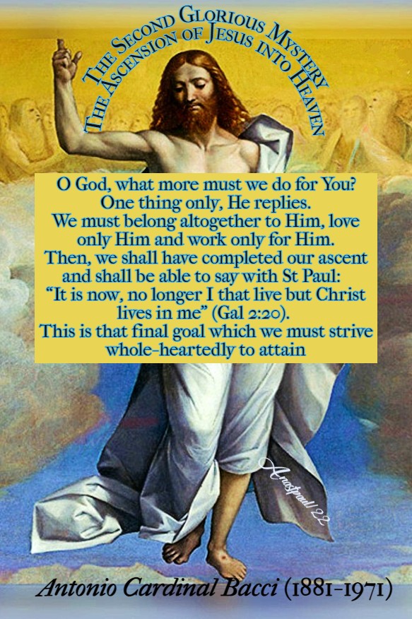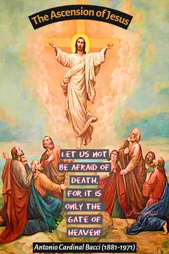 “When we meditate on the Ascension, we should humbly ask God, to give us the grace, to strip ourselves of our sins and defects. Then we shall be able to fly towards Him with love and hope in this life and, when our soul has been set free from the body which imprisons it on earth, we shall be able to set out on our last joyful flight into His presence. These are the reflections which should be in our minds around the feast of the Ascension. These are the desires which we should foster and the resolutions which we should form. Let us ask Our Lord, to bless them.