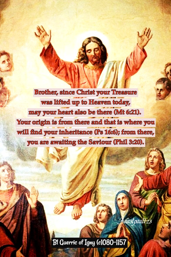 Brother, since Christ your Treasure was lifted up to Heaven today, may your heart also be there (Mt 6:21). Your origin is from there and that is where you will find your inheritance (Ps 16:6); from there, you are awaiting the Saviour (Phil 3:20).” – Blessed Guerric of Igny (c1080-1157) Cistercian Abbot (Sermon for the Ascension).