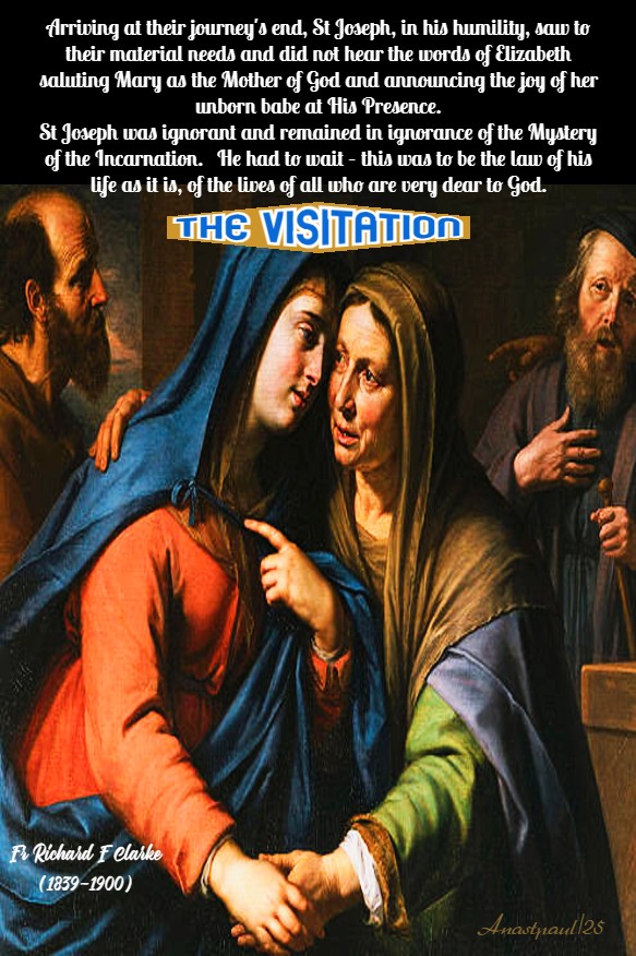 +3. Arriving at their journey’s end, St Joseph, in his humility, saw to their material needs and did not hear the words of Elizabeth saluting Mary as the Mother of God and announcing the joy of her unborn babe at His Presence.