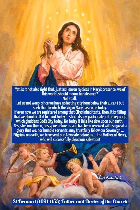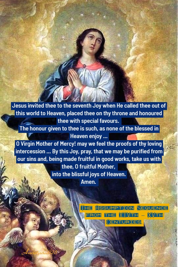By this Joy, pray that we may be purified from our sins and, being made fruitful in good works, take us with thee, O fruitful Mother, into the blissful joys of Heaven. Amen. ” – Latin Liturgy – The Assumption Sequence from the XIVth – XVth Centuries.