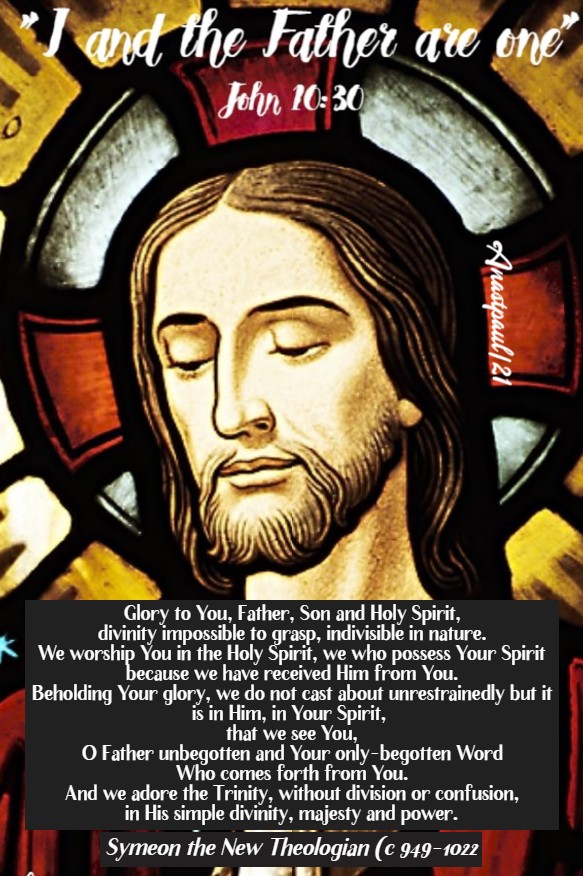 Glory to You, Father, Son and Holy Spirit, divinity impossible to grasp, indivisible in nature. We worship You in the Holy Spirit, we who possess Your Spirit because we have received Him from You. Beholding Your glory, we do not cast about unrestrainedly but it is in Him, in Your Spirit, that we see You, O Father unbegotten and Your only-begotten Word Who comes forth from You. And we adore the Trinity, without division or confusion, in His simple divinity, majesty and power.” – Symeon the New Theologian (c 949-1022) Monk – Hymn 21