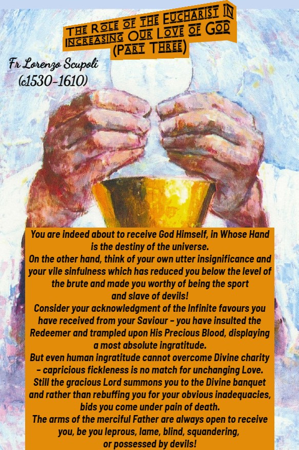 REFLECTION – “You owe your whole life to Christ Jesus, for He gave His Life for your life and endured bitter torments that you might not have to endure eternal torment … Is there anything which will not seem sweet to you, after you have gathered into your heart, all the bitter sufferings of your Lord? … As the heavens are higher than the earth (Is 55:9) so is His Life higher than our life and yet, it has been given for our life. As mere nothingness cannot be compared to any other thing, so our life cannot be measured against His…