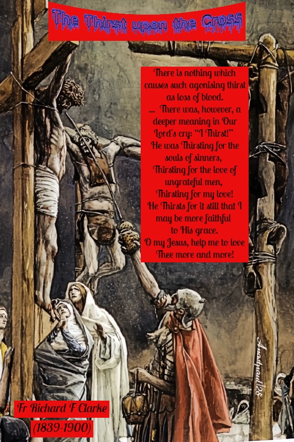 What must have been the intolerable suffering of Our Lord, Whose Sacred Body had been gradually drained of every droop of Blood! All day long the Blood had been flowing – at the scourging, on the way to Calvary, as He was dragged hither and thither, with the sharp cords cutting His wrists. And now upon the Cross ,as from Hands and Feet a stream bedewed the ground, fiercer and fiercer grew the burning, parching Thirst which consumed Him.