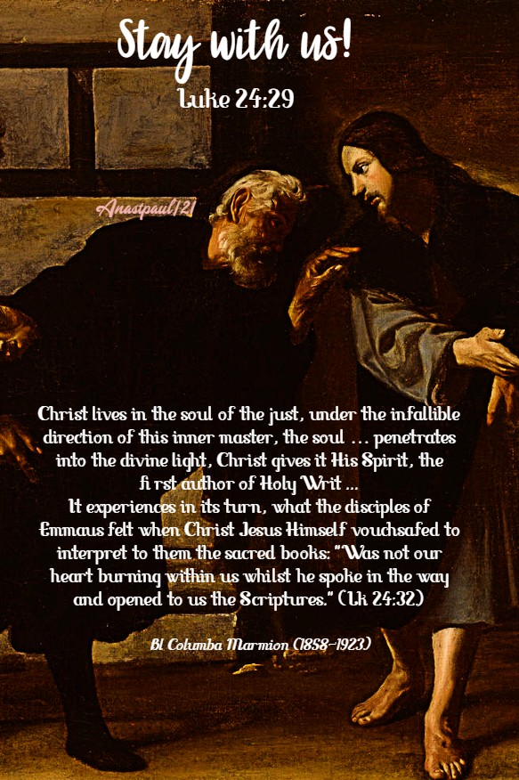 What is there astonishing, then, in the fact, that the soul, charmed and won by this living Word, “which penetrates even to the marrow” (Heb 4:12) makes the prayer of these disciples its own – “Stay with us! O Thou the incomparable Master, indefectible Light, infallible Truth, the only true Life of our souls!” Forestalling these holy desires “the Holy Spirit Himself prays for us with unspeakable groanings” which constitute true prayer, these vehement desires to possess God, to live no longer save for the Father’s glory and for that of His Son Jesus. Love becomes great and burning by contact with God, takes possession of all the powers of the soul, renders it strong and generous, to do perfectly, all the Father’s will, to give itself up ,wholly to the divine good pleasure.” – Blessed Columba Marmion (1858-1923) Abbot – Monastic prayer (Christ, the Ideal of the Monk)