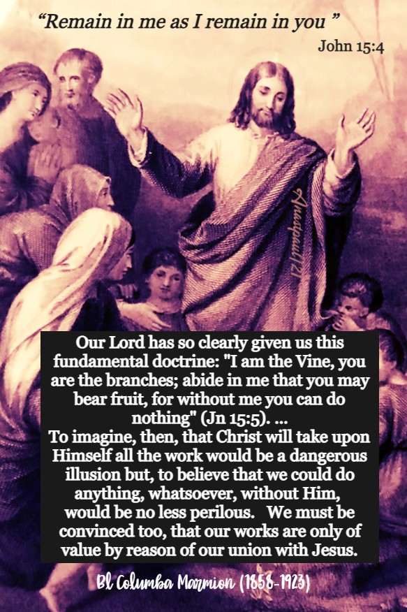 To imagine, then, that Christ will take upon Himself all the work would be a dangerous illusion but, to believe that we could do anything, whatsoever without Him, would be no less perilous. We must be convinced too, that our works are only of value by reason of our union with Jesus. ” – Blessed Columba Marmion (1858-1923) Abbot – The “instruments of good works” (Christ, the Ideal of the Monk