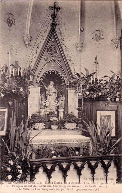 The Abbot Orsini wrote: “Our Lady de la Breche, at Chartres, where a procession takes place every year, in thanksgiving for Our Lady’s having delivered the City, when besieged by heretics, in the year 1568. It was during this siege that the image of Our Lady, placed upon the Drouaise gate, could not be injured by the cannon and musket balls, which the besiegers fired at it and the marks of which, are still seen at two or three inches from the image.”