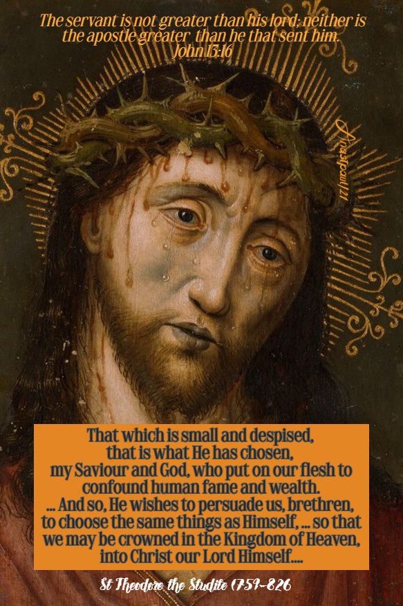 This is why He was born in a cave, was laid in a manger, was called the son of a carpenter, called a Nazarene. He was clothed in one poor tunic and a single cloak; He went by foot, suffered, was stoned by the Jews (cf. Jn 10:31), insulted, arrested, crucified, pierced with a lance, placed in the tomb, after which He rose again. And so, He wishes to persuade us, brethren, to choose the same things as Himself before the angels, so that we may be crowned in the Kingdom of Heaven, into Christ our Lord Himself, to whom belongs glory and power, together with the Father and Holy Spirit, now and forever. Amen.” … St Theodore the Studite (759-826) Monk and Theologian at Constantinople – Catechesis 78