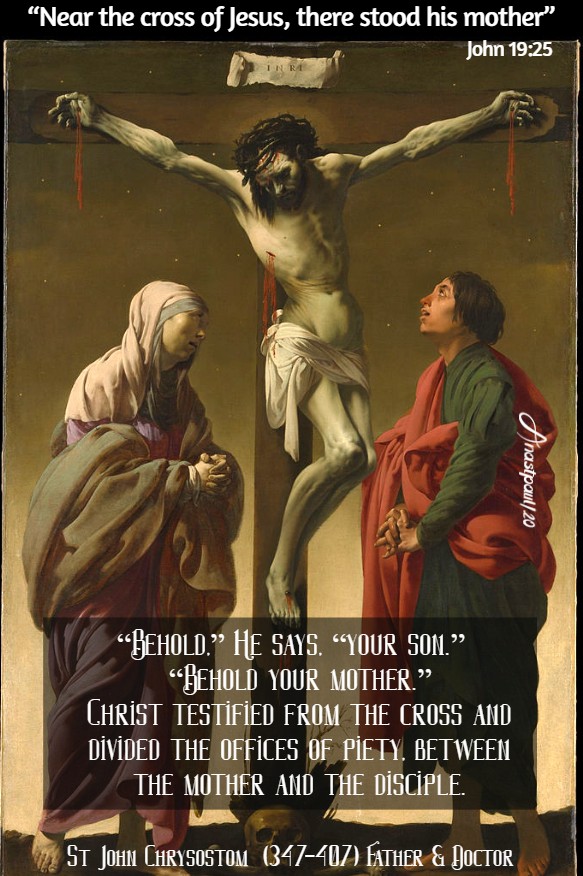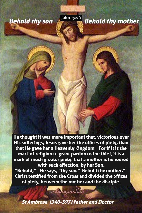 Loving her as He did, Jesus “Loved her to the end” (Jn 13:1), so as not only to bring His life to an end, for her but also, to speak almost His last words for her benefit. As His last will and testament, He committed, to His beloved heir, the care of His Mother… The Church fell to Peter, Mary to John. This bequest belonged to John, not only by right of kinship but too, because of the privilege, love had bestowed and the witness, his chastity bore… It was fitting that none other than the beloved of her Son, should minister to the Mother of the Lord… Providence too arranged, very conveniently that he who was to write a Gospel, should have intimate conferences with her, who knew about them all, for she had taken note from the beginning, of everything that happened to her Son and “treasured all the words concerning Him, pondering them in her heart” (Lk 2:19).” – (4th Sermon for the Assumption).