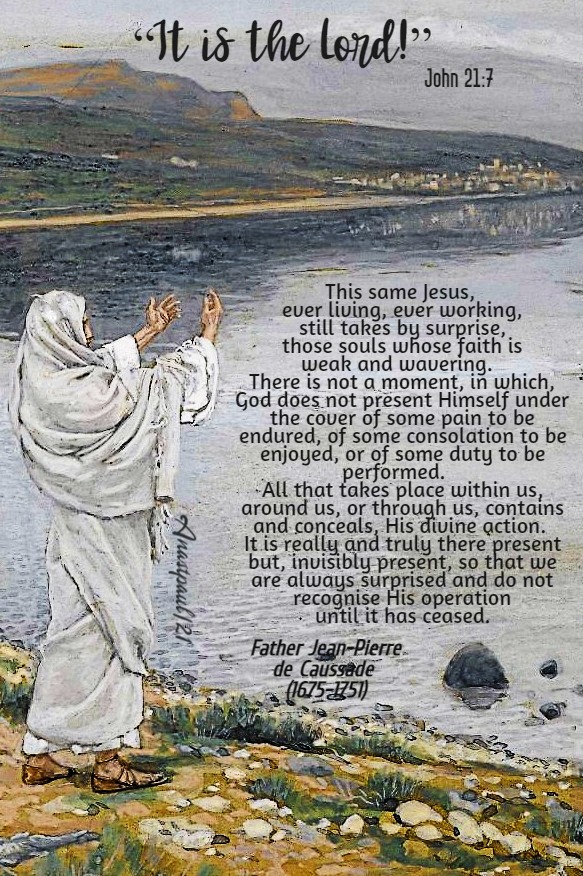 After the Resurrection, Jesus Christ took His disciples by surprise in His various apparitions. He showed Himself to them, under various disguises and, in the act of making Himself known to them, disappeared. This same Jesus, ever living, ever working, still takes by surprise, those souls whose faith is weak and wavering. There is not a moment, in which, God does not present Himself under the cover of some pain to be endured, of some consolation to be enjoyed, or of some duty to be performed. All that takes place within us, around us, or through us, contains and conceals, His divine action. It is really and truly there present but, invisibly present, so that we are always surprised and do not recognise His operation until it has ceased.
