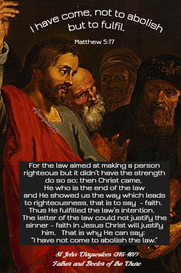 Indeed, as the Apostle Paul says, everything written on the stone tablets, “you shall not commit adultery, you shall not kill. .. you shall not covet” and whatever other commandments there may be, are summed up in this saying: “You shall love your neighbour as yourself. Love does no evil to the neighbour; hence, love is the fulfilment of the Law” (Rm 13:9f.; Lv 19:18) … This charity has been “poured into our hearts through the Holy Ghost Who is given to us” (Rm 5:5).” – St Augustine (354-430) Father and Doctor of Grace (On the spirit and the letter, 28-30).