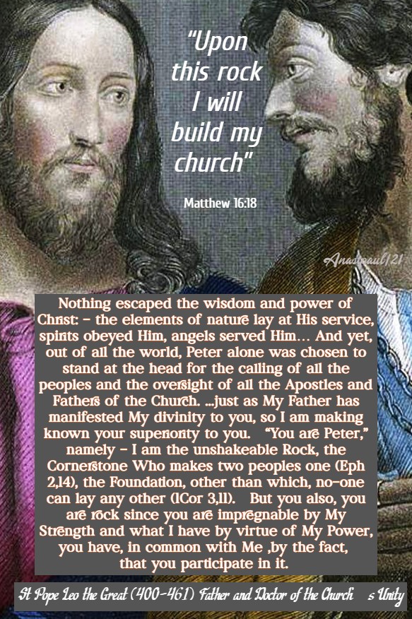 REFLECTION – “Thou art Peter and upon this rock I shall build My Church.” He was given this name of ‘Peter’ because he was the first to set the foundations of the faith among the nations and because, he is the indestructible rock on which rests the judgement seat and the whole edifice, belonging to Christ Jesus. It was on account of his faithfulness that he was called Peter, whereas our Lord receives the same name on account of his power according to Saint Paul’s words: “They drank from a spiritual rock which followed them and that rock ,was the Christ” (1 Cor 10:4). Yes, the Apostle chosen to be his co-worker merited to share the same Name as Christ. They built the same building together – Peter does the planting, the Lord gives the increase and it is the Lord, too, Who sends those who will do the watering (cf 1 Cor 3:6).