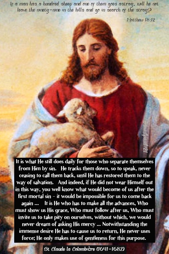 The zeal with which God pursues us is undoubtedly the result of a very great mercy. But the sweetness by which this zeal is accompanied shows an even more wonderful goodness. Notwithstanding the immense desire He has to cause us to return, He never uses force; He only makes use of gentleness for this purpose. In all the Gospel I see no sinner who was invited to repent except by endearments and kindness.” – St Claude la Colombière SJ (1641-1682) “Apostle of the Sacred Heart” (A sermon preached in London before the Duchess of York).