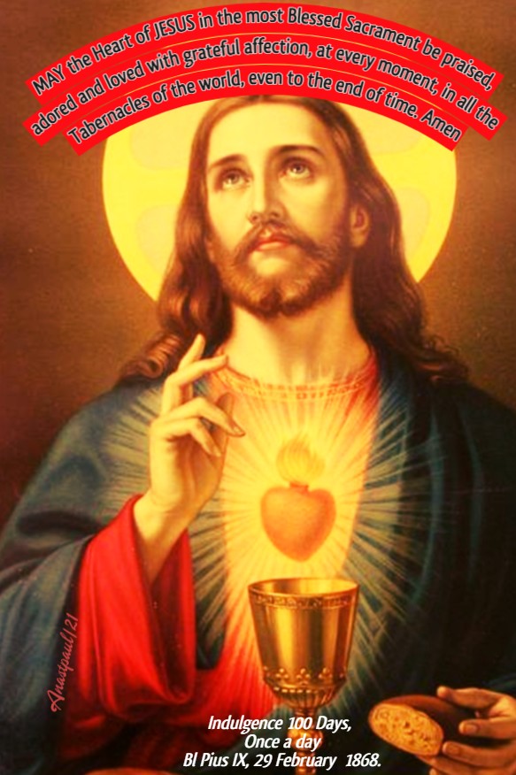 All praise, honour and glory to the Divine Heart of JESUS. (This Ejaculation is Indulgenced – 50 Days, once a day. (See Instructions: – Unless otherwise stated, e.g., “once a day,” a partial Indulgence may be gained any number of times in succession.) 168 Pope Leo XIII, 14 June 1901).