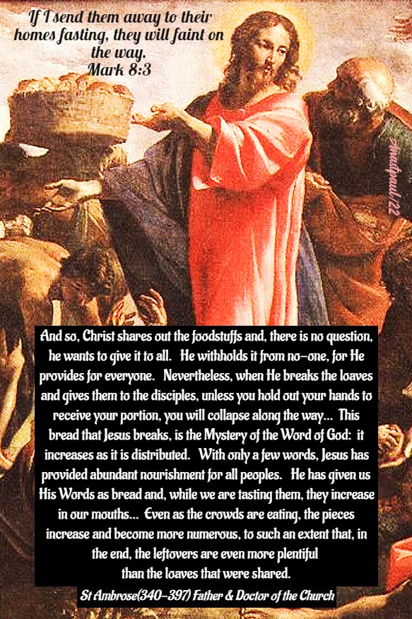 And so, Christ shares out the foodstuffs and, there is no question, He wants to give it to all. He withholds it from no-one, for He provides for everyone. Nevertheless, when He breaks the loaves and gives them to the disciples, unless you hold out your hands to receive your portion, you will collapse along the way … This bread which Jesus breaks, is the Mystery of the Word of God: it increases as it is distributed. With only a few words, Jesus has provided abundant nourishment for all peoples. He has given us His Words as bread and, while we are tasting them, they increase in our mouths … Even as the crowds are eating, the pieces increase and become more numerous, to such an extent that, in the end, the leftovers are even more plentiful than the loaves that were shared.” – St Ambrose (340-397) Bishop of Milan, Father and Doctor of the Church (Commentary on the Gospel of Saint Luke VI, 73-88).
