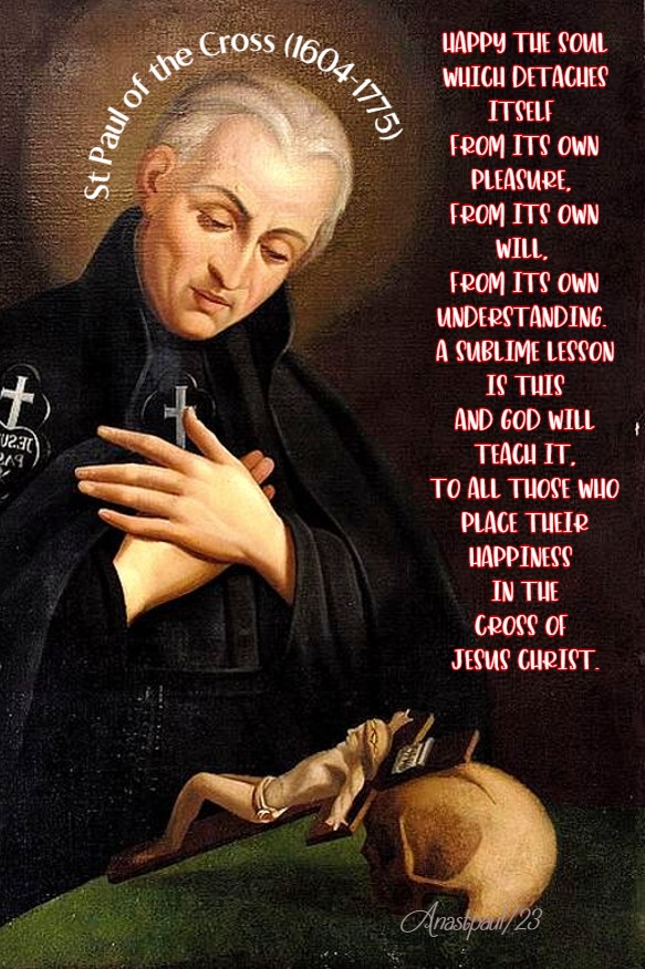 “Happy the soul which detaches itself from its own pleasure, from its own will, from its own understanding. A sublime lesson is this and God will teach it, to all those who place their happiness in the Cross of Jesus Christ.”