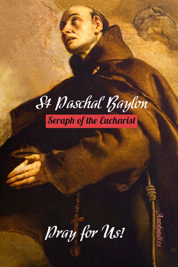 PRAYER – O God, Who endowed blessed Paschal, Your Confessor, with a wondrous love for the Sacred Mysteries of Your Body and Blood, mercifully grant that we may be found worthy to share in the same spiritual abundance, which he received in this Divine Banquet. Who lives and reigns with God the Father, in the unity of the Holy Ghost, God, world without end. Amen (Collect).
