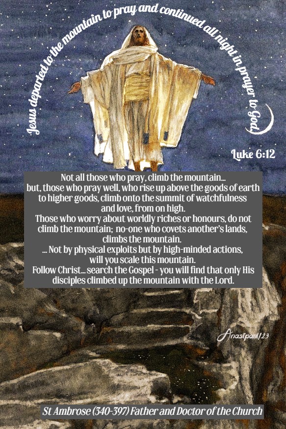 REFLECTION – “At that time, Jesus departed to the mountain to pray and He spent the night in prayer to God.” Not all those who pray, climb the mountain … but, those who pray well, who rise up above the goods of earth to higher goods, climb onto the summit of watchfulness and love, from on high. Those who worry about worldly riches or honours, do not climb the mountain; no-one who covets another’s lands, climbs the mountain. Those who seek God, go up it and those who go up, beg the Lord’s aid for their journey. All great and noble souls climb the mountain, for it is not to the first comer alone that the Prophet says: “Go up onto a high mountain, thou who announce glad tidings to Sion. Cry out at the top of thy voice, thou who bring good news to Jerusalem,” (Is 40:9). Not by physical exploits but by high-minded actions, will you scale this mountain. Follow Christ … search the Gospel – you will find that only His disciples climbed up the mountain with the Lord.” – St Ambrose (340-397) Archbishop of Milan, Father and Doctor of the Church (On the Gospel of Saint Luke 5,41).