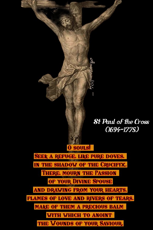 “O souls! Seek a refuge, like pure doves, in the shadow of the Crucifix. There, mourn the Passion of your Divine Spouse and drawing from your hearts, flames of love and rivers of tears, make of them a precious balm with which to anoint the Wounds of your Saviour.”