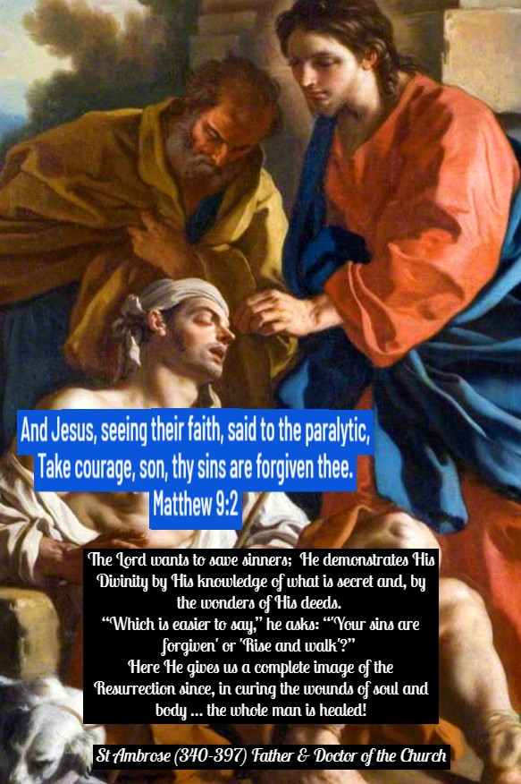 The Lord wants to save sinners; He demonstrates His Divinity by His knowledge of what is secret and, by the wonders of His deeds. “Which is easier to say,” he asks: “’Your sins are forgiven’ or ‘Rise and walk’?” Here He gives us a complete image of the Resurrection since, in curing the wounds of soul and body … the whole man is healed!” – St Ambrose (340-397) ArchBishop of Milan, Father and Doctor of the Church (Commentary on Saint Luke’s Gospel V, 11-13).