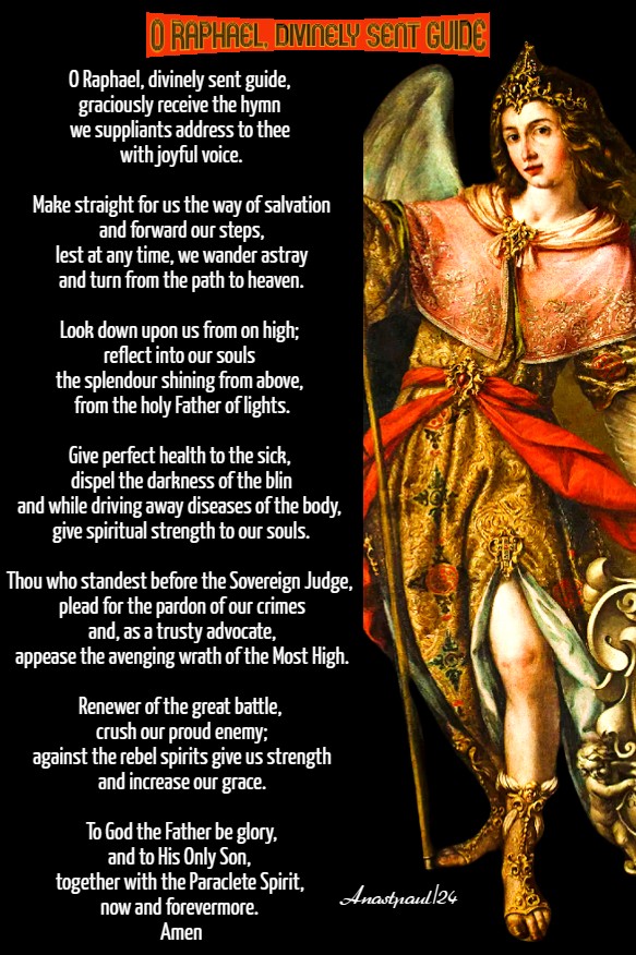 PRAYER – O God, Who gave blessed Raphael the Archangel as a traveling companion to Your servant Tobias, grant us, Your servants, ever to be protected by his guardianship and by his help.Through the same Jesus Christ, Thy Son our Lord, Who lives and reigns with Thee, in the unity of the Holy Ghost, God, world without end. Amen (Collect).