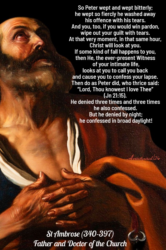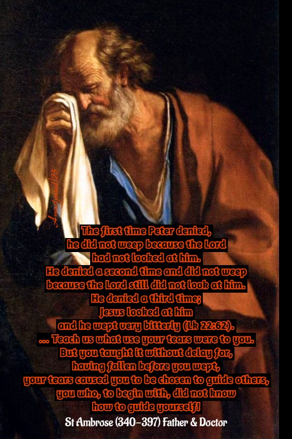 All this has been written, to make us understand, that no-one should be puffed up. If Peter fell for having said: “Though all may have their faith in Thee shaken, mine will never be” (Mt 26:33), who is there to count on himself? … From whence then, Peter, shall I call you to mind, to teach me your thoughts as you wept? From Heaven where you have already taken your place among the choirs of Angels, or from the grave? For that death, from which the Lord was raised, did not reject you in your turn. Teach us what use your tears were to you. But you taught it without delay, for having fallen before you wept, your tears caused you to be chosen to guide others, you who, to begin with, did not know how to guide yourself!” – St Ambrose (340-397) Bishop of Milan, Father and Doctor of the Church – Commentary on St Luke’s Gospel, 10,89f.