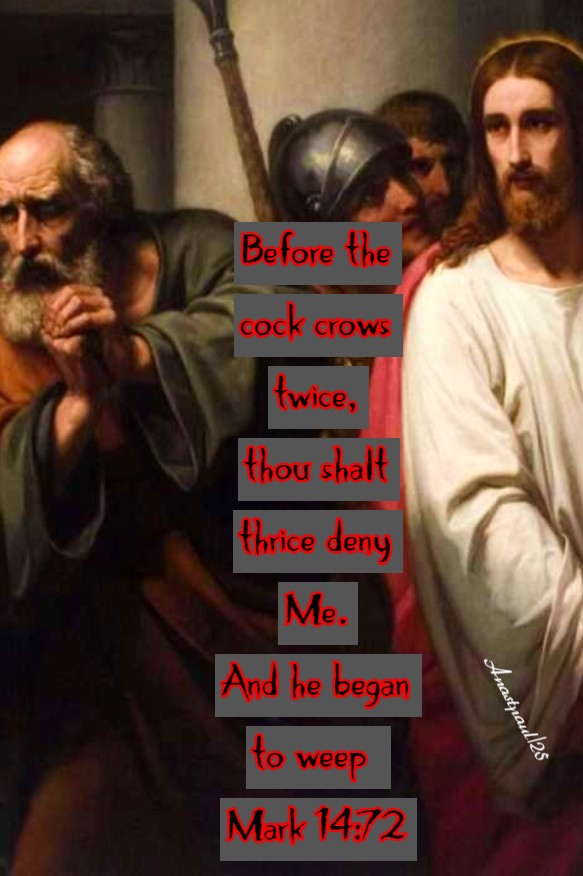 “ I know not this man of whom you speak. And immediately the cock crew again. And Peter remembered the word that Jesus had said unto him: Before the cock crows twice, thou shalt thrice deny me. And he began to weep.” – Mark 14:71-72