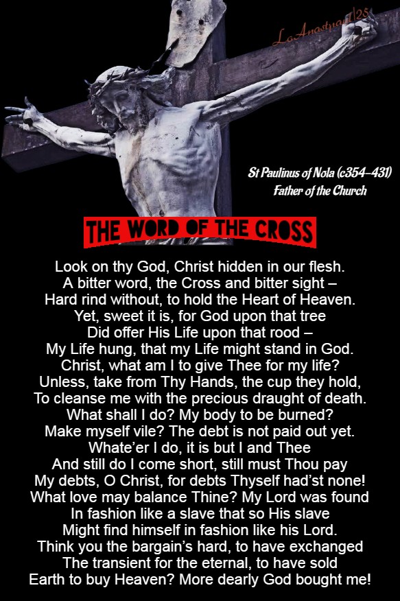 “Look on thy God, Christ hidden in our flesh. A bitter word, the Cross and bitter sight – Hard rind without, to hold the Heart of Heaven. Yet, sweet it is, for God upon that tree Did offer His Life upon that rood – My Life hung, that my Life might stand in God. Christ, what am I to give Thee for my life? Unless, take from Thy Hands, the cup they hold, To cleanse me with the precious draught of death. What shall I do? My body to be burned? Make myself vile? The debt is not paid out yet. Whate’er I do, it is but I and Thee And still do I come short, still must Thou pay My debts, O Christ, for debts Thyself had’st none! What love may balance Thine? My Lord was found In fashion like a slave that so His slave Might find himself in fashion like his Lord. Think you the bargain’s hard, to have exchanged The transient for the eternal, to have sold Earth to buy Heaven? More dearly God bought me!”