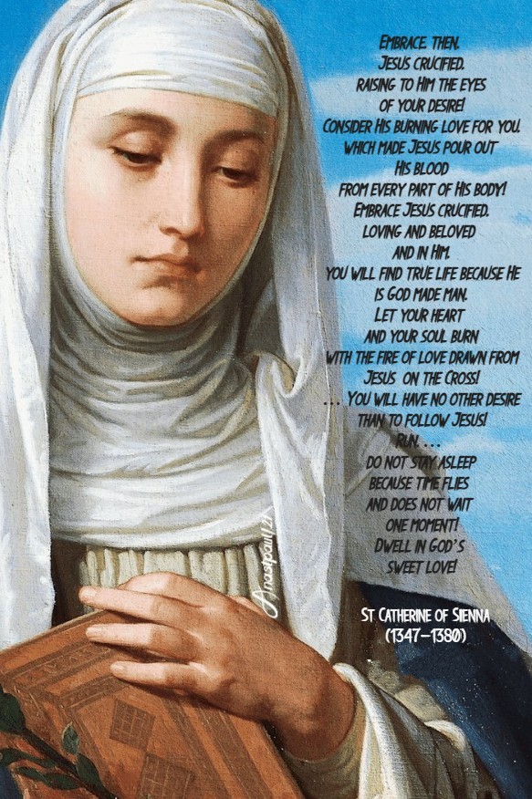 “Embrace, then, Jesus Crucified, raising to Him the eyes of your desire! Consider His burning love for you which made Jesus pour out His Blood from every part of His body! Embrace Jesus Crucified, loving and beloved and in Him, you will find true life because He is God made Man. Let your heart and your soul burn with the fire of love drawn from Jesus on the Cross! … You will have no other desire than to follow Jesus! Run, … do not stay asleep because time flies and does not wait one moment! Dwell in God’s sweet love!”
