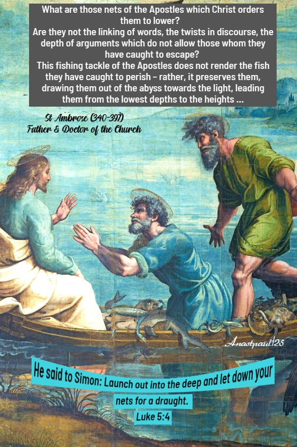 “Master, Peter said, “we have laboured all the night and have taken nothing:but at Thy Word, I will let down the net.” I too, Lord, know it is night for me, when Thou do not command me. I have not yet converted anyone through my words; it is still night. I spoke on the day of Epiphany – I lowered the net but I have not caught anything yet. I lowered the net during the day. I am waiting for Thee to give me the order. Upon Thy Word, I will lower it again. Self-confidence is empty but humility is fertile. Those who had not caught anything until then, have now, at the Lord’s Voice, caught an enormous catch of fish.” – St Ambrose (340-397) Father & Doctor of the Church (Treatise on the Gospel of Luke IV, 71-76).