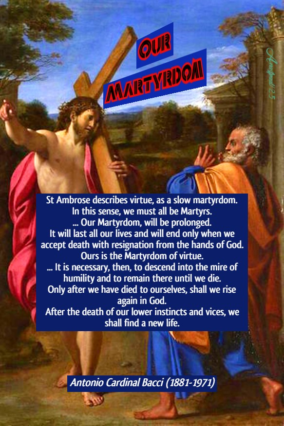 “St Ambrose describes virtue, as a slow martyrdom. In this sense, we must all be Martyrs. There is only one difference. The Martyrs of the Church shed their blood and gave up their lives for Jesus, within one hour or one day and gained their reward immediately. Our Martyrdom, on the other hand, will be prolonged. It will last all our lives and will end only when we accept death with resignation from the hands of God. Ours is the Martyrdom of virtue. Let us clearly understand, that solid Christian virtue is a slow and continual Martyrdom which will only end with death. It is not a flower which springs up spontaneously in the garden of the soul. It is like a seed which is thrown on the damp earth and must die there slowly, so that it can generate young shoots which will produce the ears of corn. “Unless the grain of wheat falls into the ground and dies, it remains alone. But, if it dies, it brings forth much fruit” (Jn 12:24-25). It is necessary, then, to descend into the mire of humility and to remain there until we die. Only after we have died to ourselves, shall we rise again in God (Cf ibid). After the death of our lower instincts and vices, we shall find a new life.”