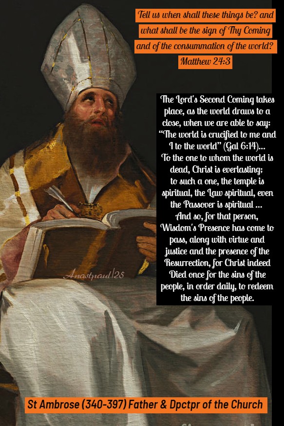 The Lord’s Second Coming takes place, as the world draws to a close, when we are able to say: “The world is crucified to me and I to the world” (Gal 6:14)… To the one to whom the world is dead, Christ is everlasting; to such a one, the temple is spiritual, the Law spiritual, even the Passover is spiritual … And so, for that person, Wisdom’s Presence has come to pass, along with virtue and justice and the presence of the Resurrection, for Christ indeed Died once for the sins of the people, in order daily, to redeem the sins of the people.” – St Ambrose (340-397) Bishop, Father & Dpctpr of the Church (Commentary on Saint Luke’s Gospel 10:6-8)
