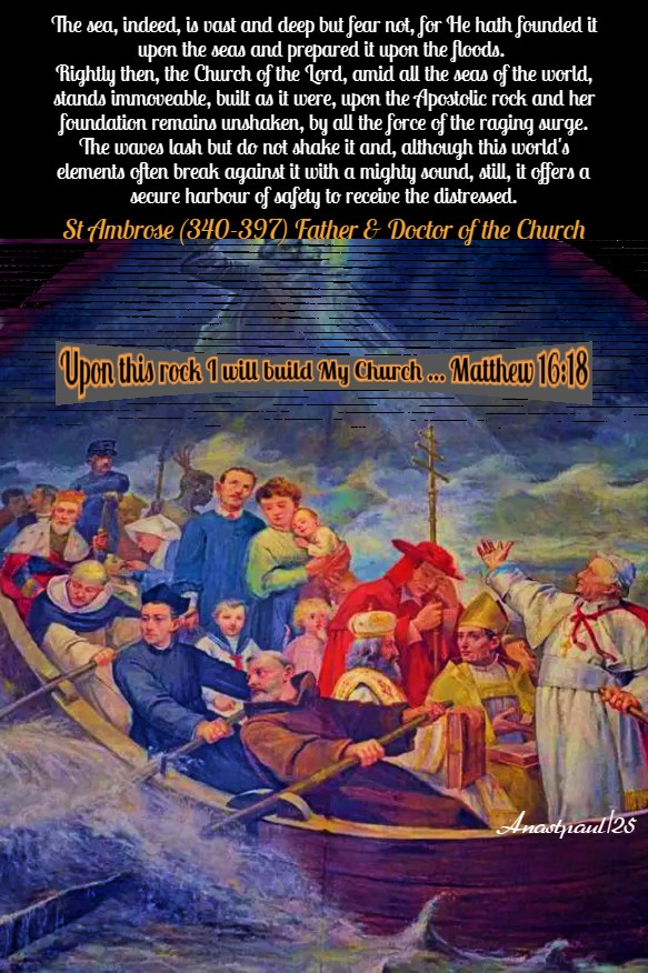 REFLECTION – “ You have undertaken the office of a Bishop and now, seated in the stern of the Church, you are steering it in the teeth of the waves. Hold the rudder of faith fast that you may not be shaken by the heavy storms of this world. The sea, indeed, is vast and deep but fear not, for He hath founded it upon the seas and prepared it upon the floods. Rightly then, the Church of the Lord, amid all the seas of the world, stands immoveable, built as it were, upon the Apostolic rock and her foundation remains unshaken, by all the force of the raging surge. The waves lash but do not shake it and, although this world’s elements often break against it with a mighty sound, still, it offers a secure harbour of safety to receive the distressed.