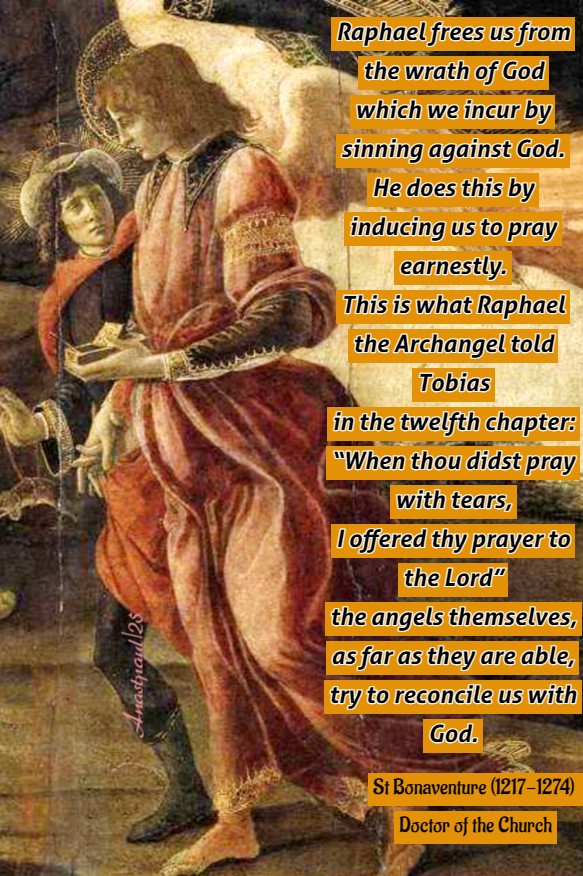 “Raphael frees us from the wrath of God which we incur by sinning against God. He does this by inducing us to pray earnestly. This is what Raphael the Archangel told Tobias in the twelfth chapter: “When thou didst pray with tears, I offered thy prayer to the Lord” the angels themselves, as far as they are able, try to reconcile us with God.”