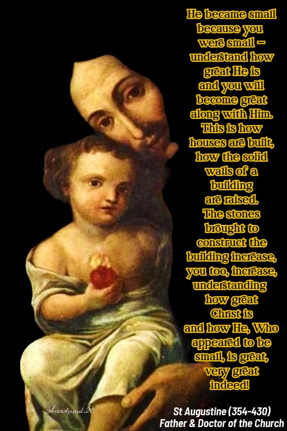 “He became small because you were small – understand how great He is and you will become great along with Him. This is how houses are built, how the solid walls of a building are raised. The stones brought to construct the building increase, you too, increase, understanding how great Christ is and how He, Who appeared to be small, is great, very great indeed! …”