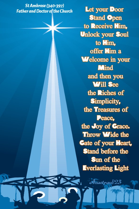 So, even Christ remains outside, if you shut the door of your soul. It is true that He could enter but He does not want to use force, He does not put those who refuse under pressure. Descended from the Virgin, born from her womb, He shines throughout the universe to give Light to all. Those who long to receive the Light which shines with an everlasting brightness, open up to Him. No night comes to intervene. Indeed, the sun we see each day gives way to night’s darkness but the Sun of Justice (Mal 3:20) knows no setting for Wisdom is not overcome by evil.” – St Ambrose (340-397) Bishop of Milan and Father and Doctor of the Church – 12th Sermon on Psalm 118