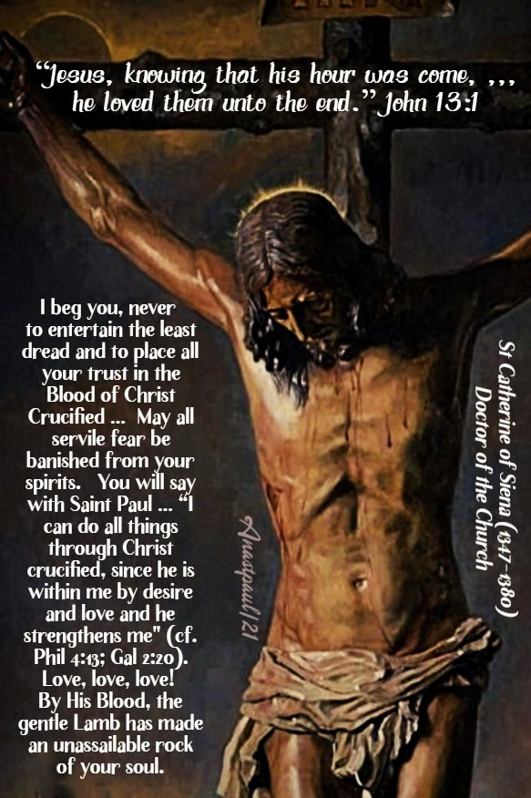 That is why, my beloved, I beg you never to entertain the least dread and to place all your trust in the Blood of Christ Crucified … May all servile fear be banished from your spirits. You will say with Saint Paul …: “I can do all things through Christ crucified, since he is within me by desire and love and he strengthens me” (cf. Phil 4:13; Gal 2:20). Love, love, love! By His Blood, the gentle Lamb has made an unassailable rock of your soul.” – St Catherine of Siena (1347-1380) Dominican tertiary, Doctor of the Church, Co-patron of Europe – Letter 129