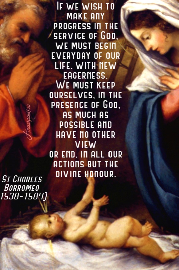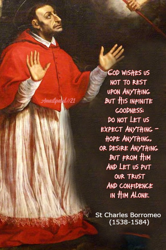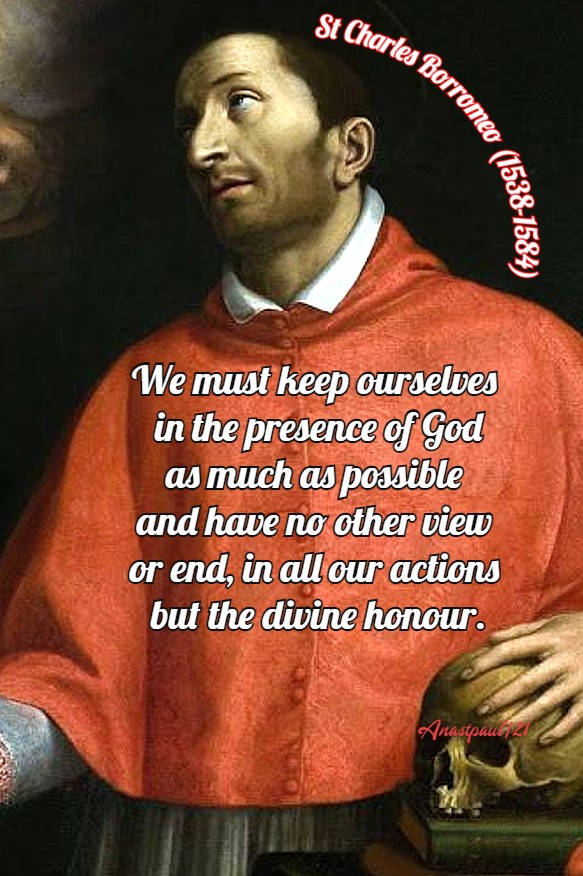 PRAYER – Safeguard Thy Church, O Lord, under the continual protection of St Charles, Thy Confessor and Bishop, so that just as his concern for his flock made him glorious, so his intercession may make us ever fervent in loving Thee. Through Jesus Christ, Thy Son our Lord, Who lives and reigns with Thee, in the unity of the Holy Ghost, God, world without end. Amen (Collect).