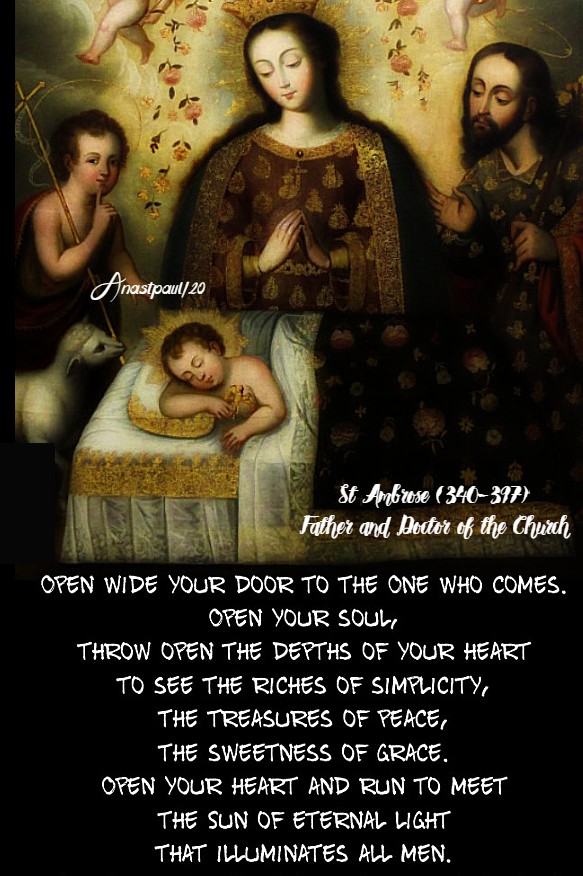 “Open wide your door to the One who comes. Open your soul, throw open the depths of your heart to see the riches of simplicity, the treasures of peace, the sweetness of grace. Open your heart and run to meet the Sun of eternal light that illuminates all men.”