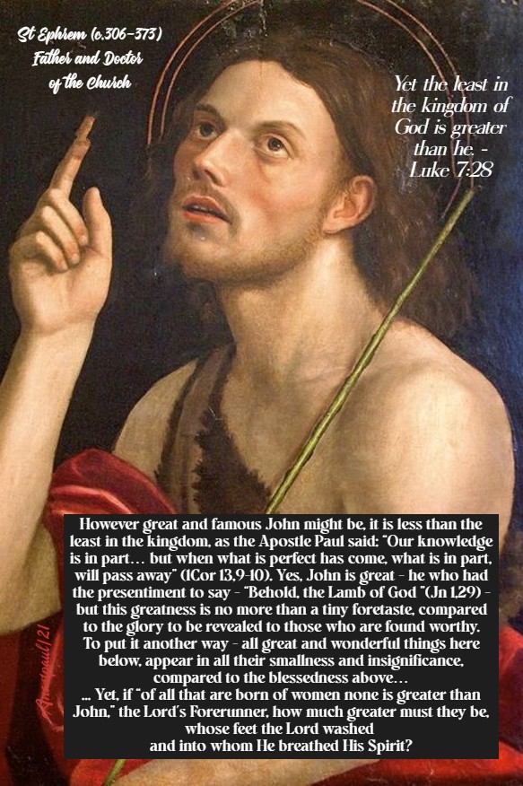 Five of them were foolish and five of them were prudent,” the Lord says. Their virginity had nothing to do with Him calling them wise, for they were all virgins but rather, their good works. Even though your chastity is of angelic holiness, note well that the Angels’ holiness is free of all envy or other evil. So even though you are not rebuked for impurity, take care not to be so, for impatience or anger either… “Gird your loins” so that chastity may lighten our steps. “And light your lamps” (Lk 12:35) because the world is black as night, it stands in need of the light of the upright. “Your light must shine before others, that they may see your good deeds and glorify your heavenly Father” (Mt 5:16).” – St Ephrem (306-373) Deacon in Syria, Father and Doctor of the Church [Commentary on the Diatessaron, 18, 15f. ; SC 121] (trans. cf Breviary).