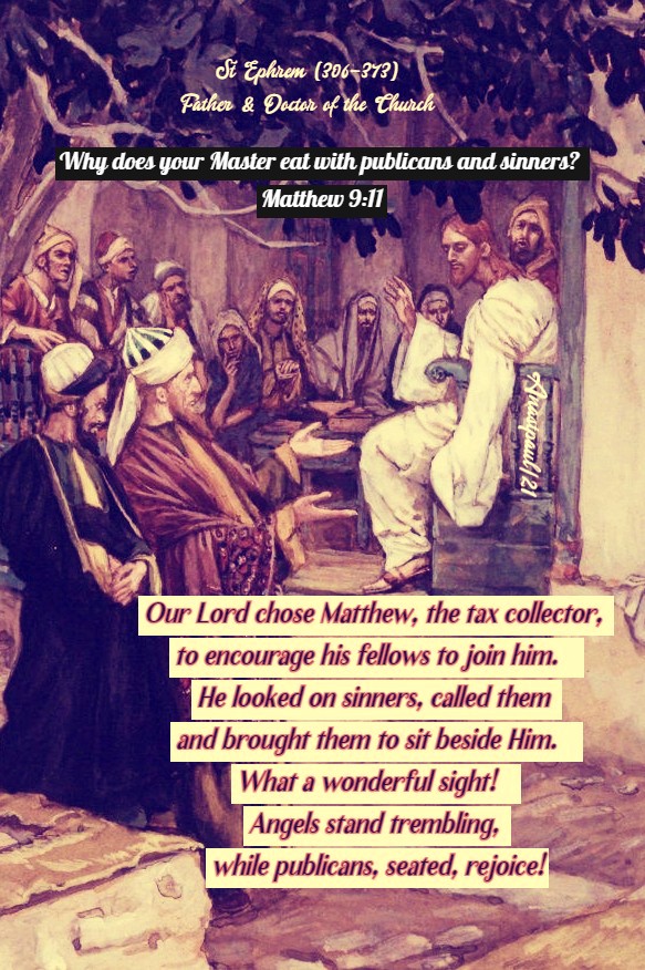 This greeting of peace did not dry up; it began in the Apostles and then sprang up in their brethren, revealing the Lord’s inexhaustible treasures. … Present in those who offered greetings in this way and in those who welcomed the greeting, this announcement of peace was neither diminished nor divided. It announced that the Father is near and is in everyone; it revealed that the Son’s mission is bound up with all, even if its object is to be with His Father. It will not cease to proclaim that images are now brought to completion and Truth will cast all shadows away at last.” – St Ephrem (306-373) Father and Doctor of the Church (Diatessaron 8: 3-4).
