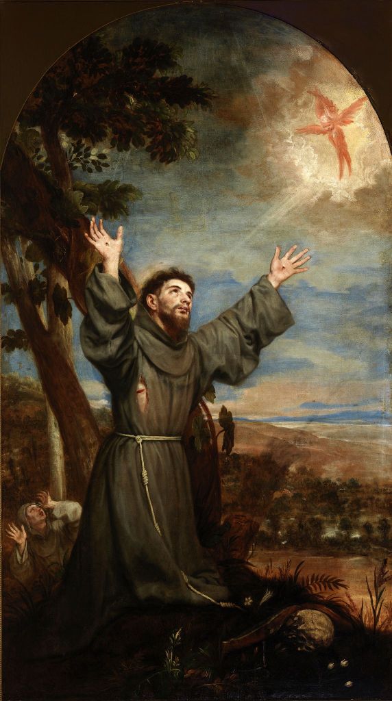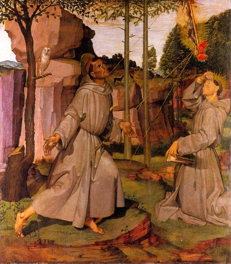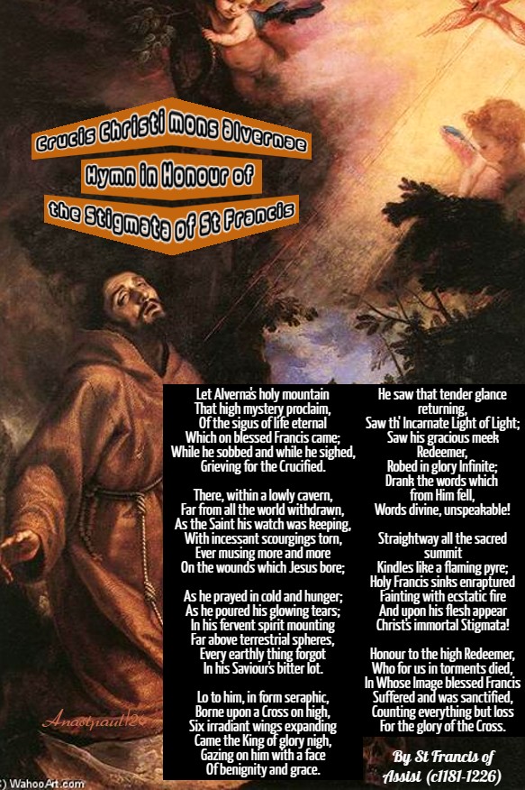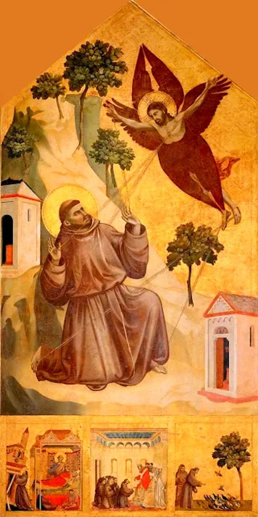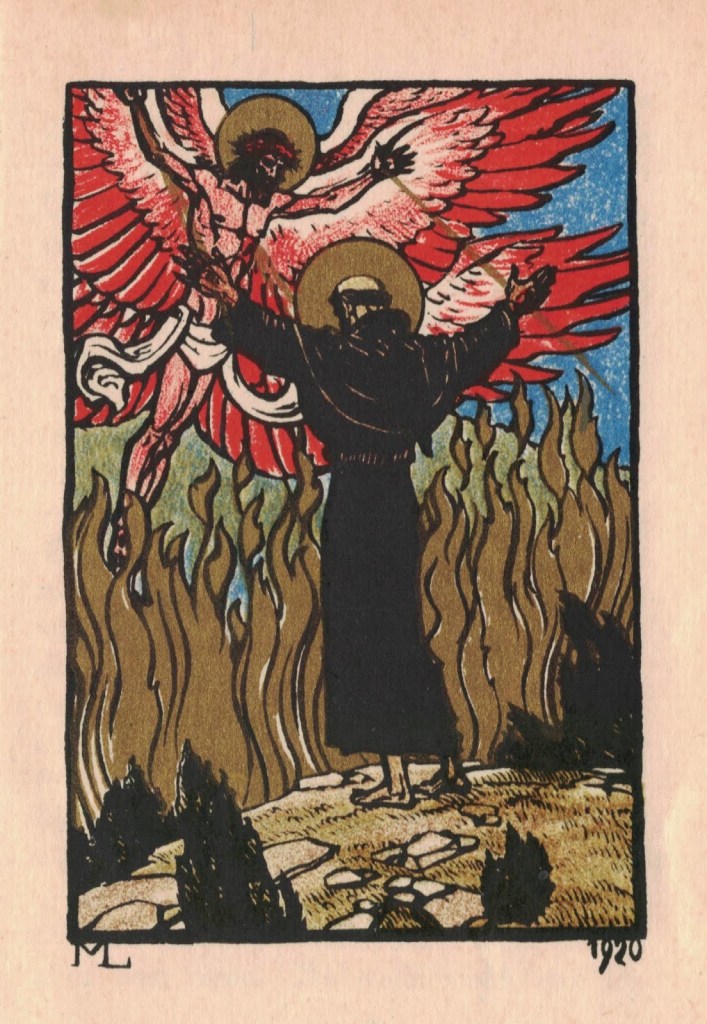 Straightway all the sacred summit Kindles like a flaming pyre; Holy Francis sinks enraptured Fainting with ecstatic fire And upon his flesh appear Christ’s immortal Stigmata!